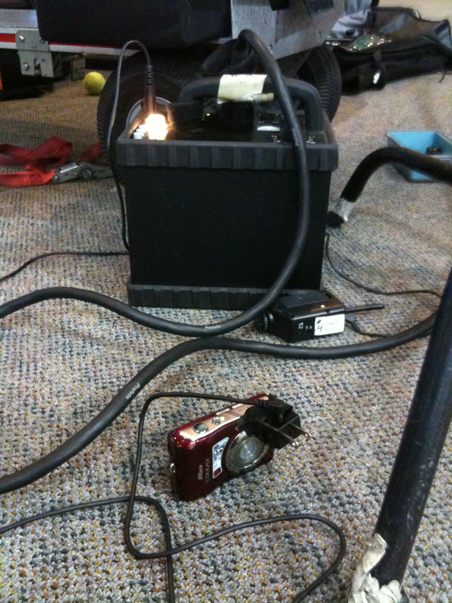 Light-slaved, hard-wired. Note tennis ball. Very important to have at least two on every job.