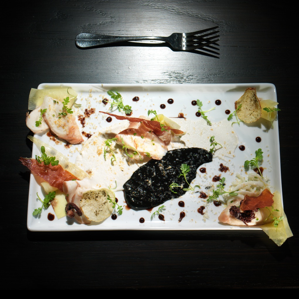Schwa restaurant.  Octopus with pineapple, macadamia nut and char,  style of Hawaiian poke.