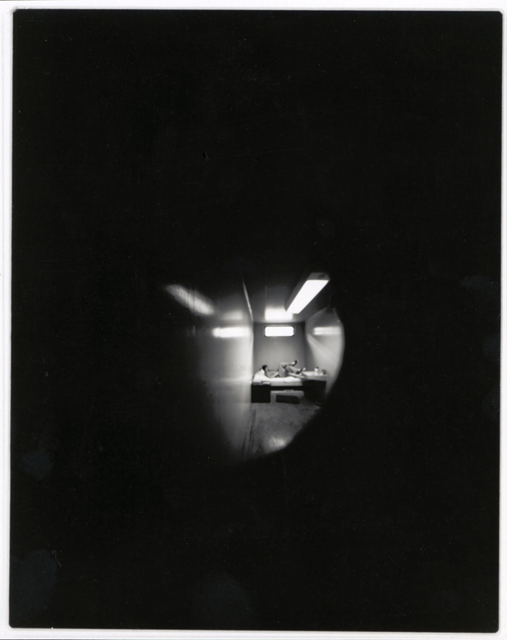 Pinhole photograph, Tamms Supermaximum Security Prison, Tamms Illinois. Shortly after the prison was opened, I had the opportunity to photograph the place for Chicago magazine. I’d heard the warden was especially proud of the cell doors, which featured holes, rather than bars. I shot this one with a homemade camera pressed against one of those doors, holding it for about fifteen seconds.