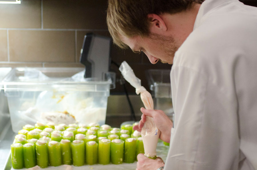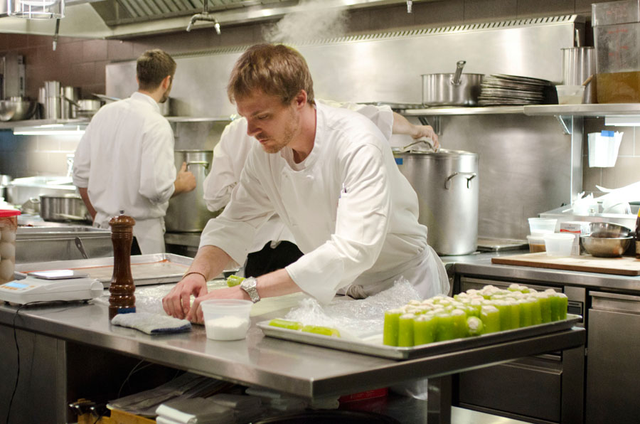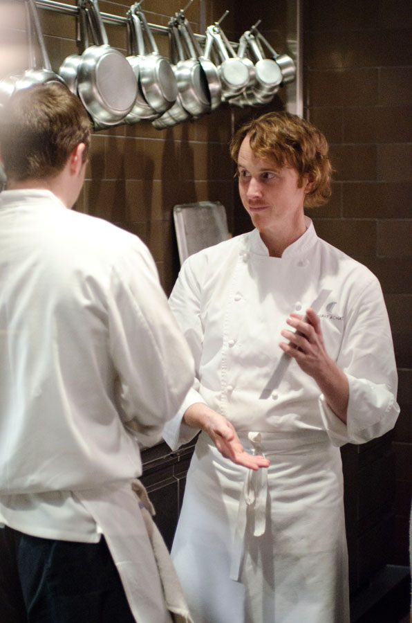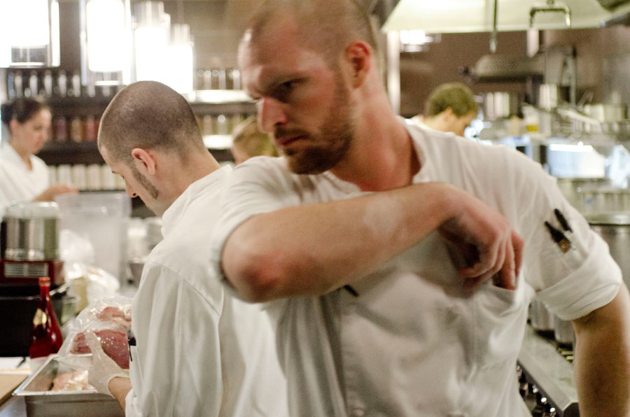 I’d watched him eviscerate sea urchins in the kitchen at Trio in Evanston, Illinois some nine years earlier – taking a portrait then for Elle magazine. One dish I’d shot then included a heated rock, topped by a dry oak leaf, then covered by a glass. Accompanying a perfectly prepared red meat – I can’t remember which – to the table, the glass was lifted and the smoke from the oak leaf wafted. Cool. Scans from film: